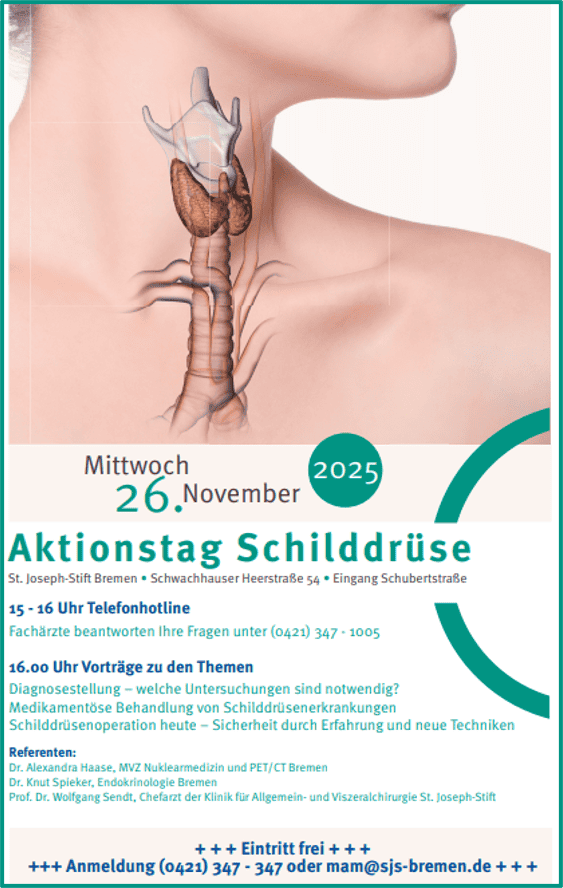 Am Mittwoch, den 26. November 2025, lädt das St. Joseph-Stift Bremen zum Aktionstag Schilddrüse ein. Die Veranstaltung bietet Ihnen die Gelegenheit, sich umfassend über Erkrankungen der Schilddrüse, aktuelle Diagnoseverfahren und moderne Behandlungsmöglichkeiten zu informieren.