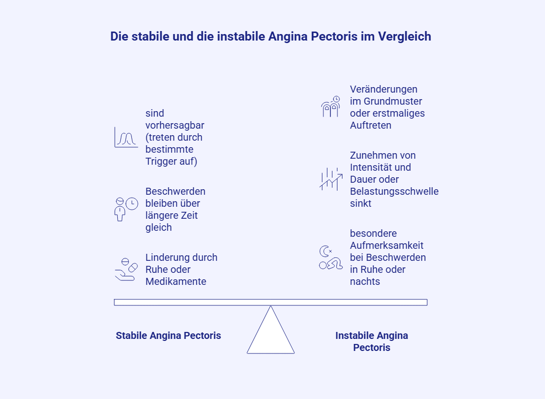 In ihrer Gesamtheit lassen die Beschwerden auch auf andere Erkrankungen, wie den Herzinfarkt (Myokardinfarkt) schließen. Im Unterschied zum Herzinfarkt klingt eine Angina Pectoris aber in Ruhe oder nach Gabe von Medikamenten innerhalb weniger Minuten ab.