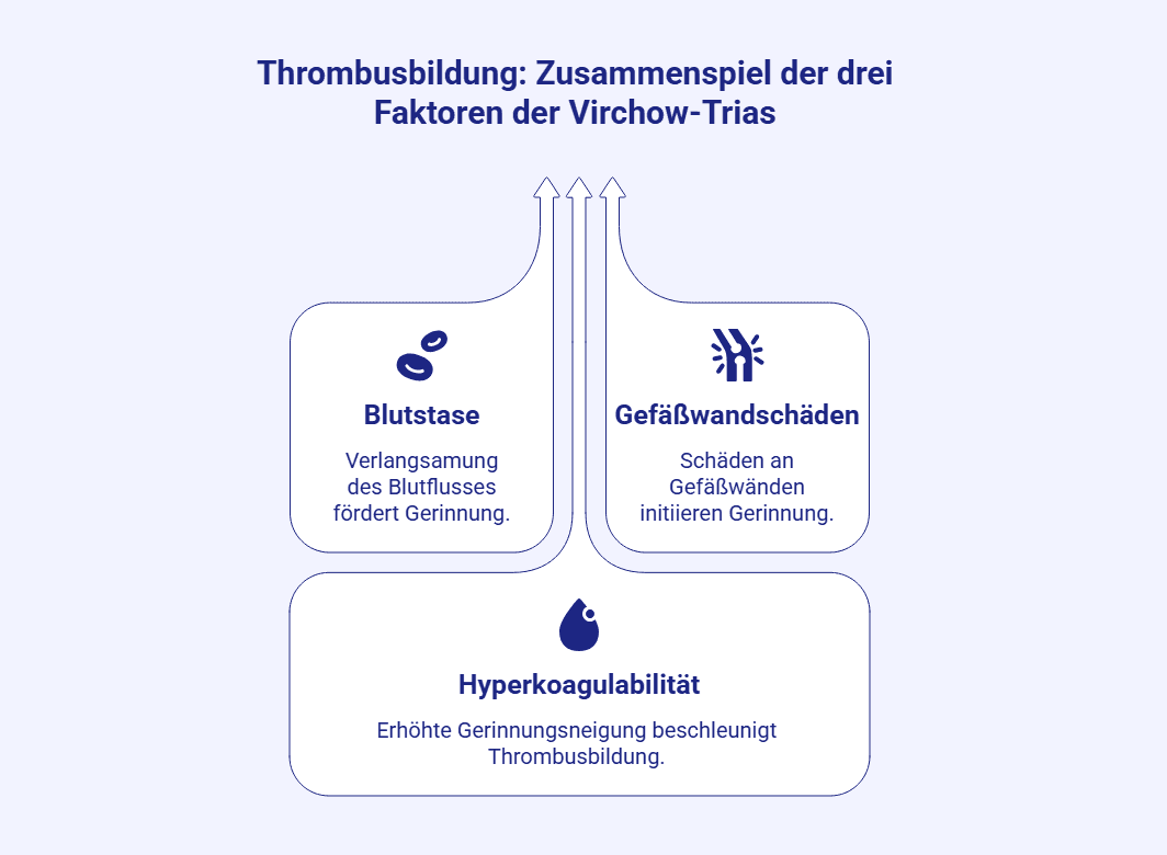 - Verlangsamter Blutfluss und eine erhöhte Gerinnungsneigung begünstigen die Entstehung einer Thrombose.